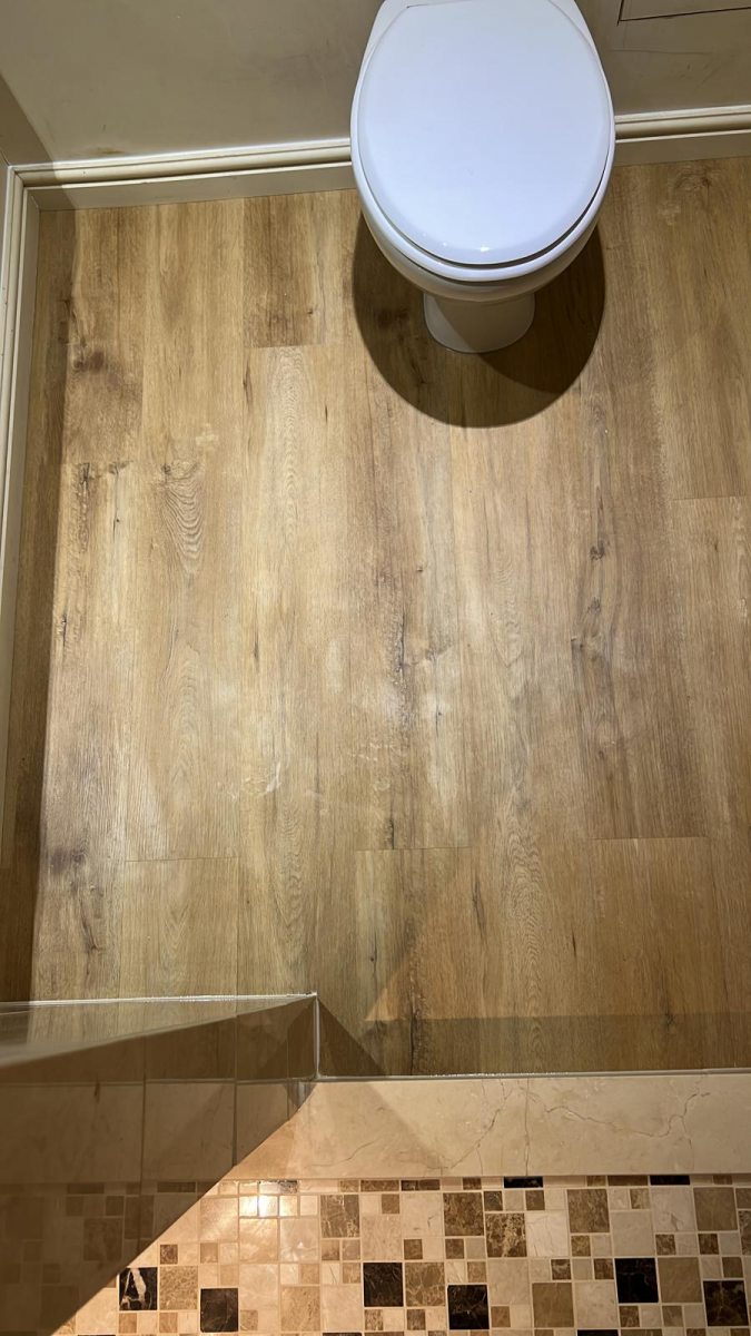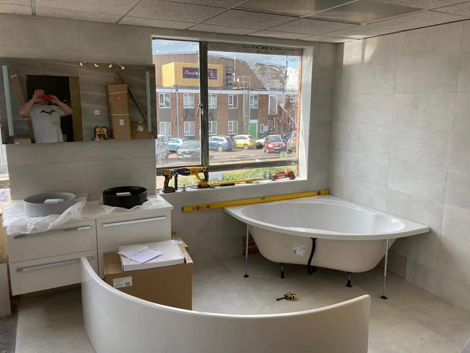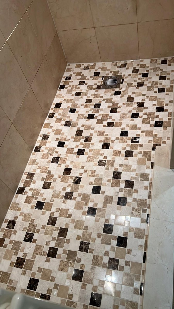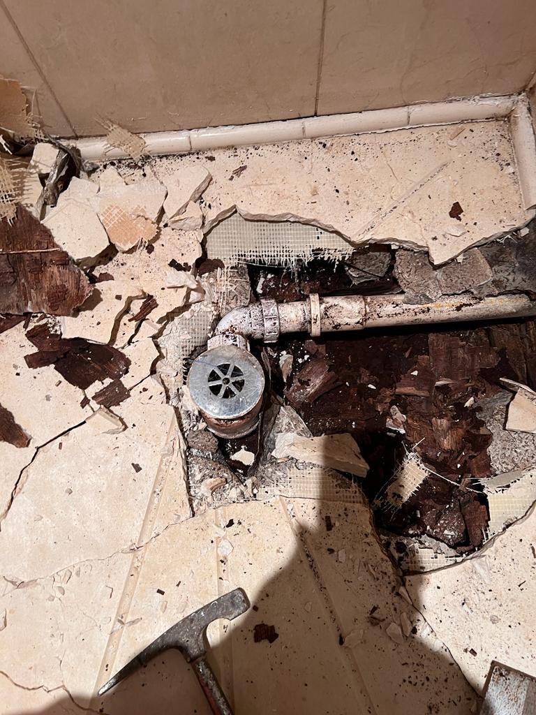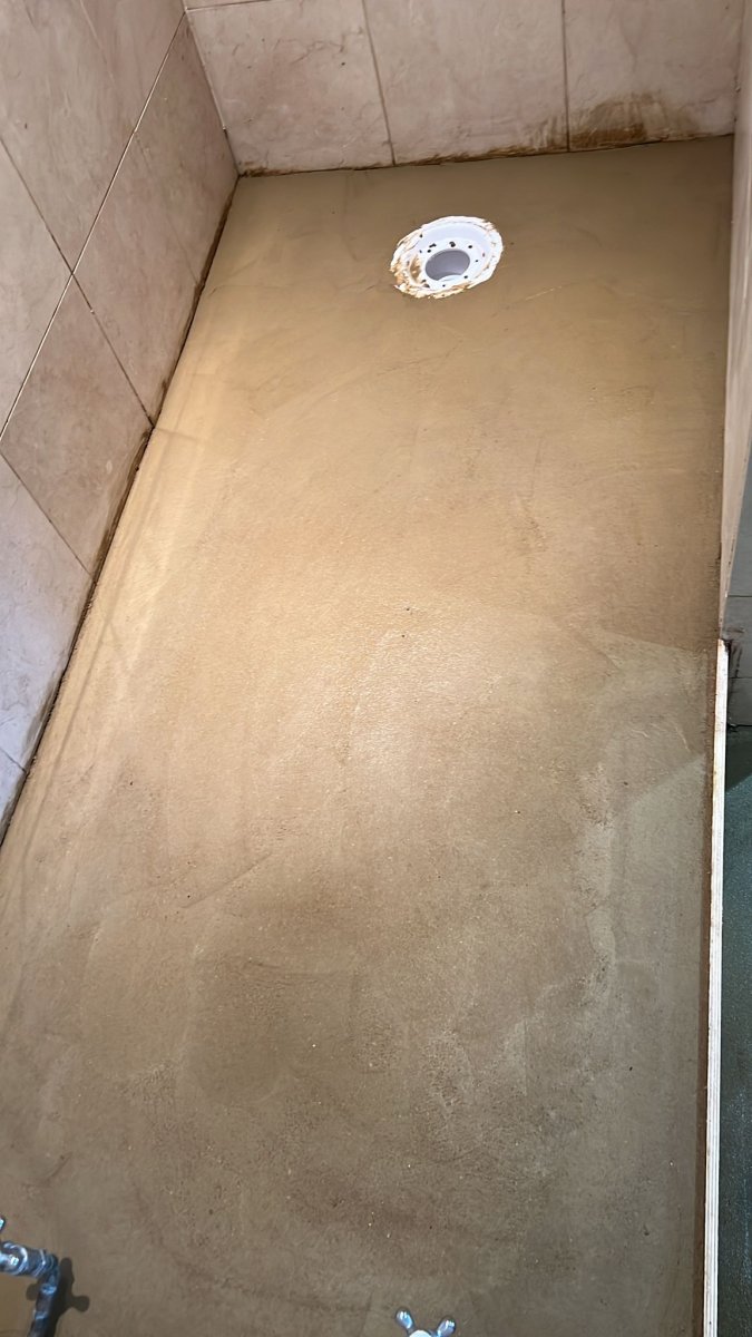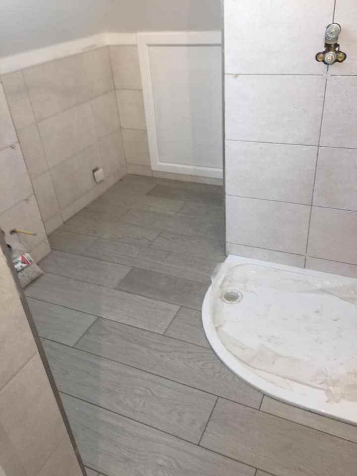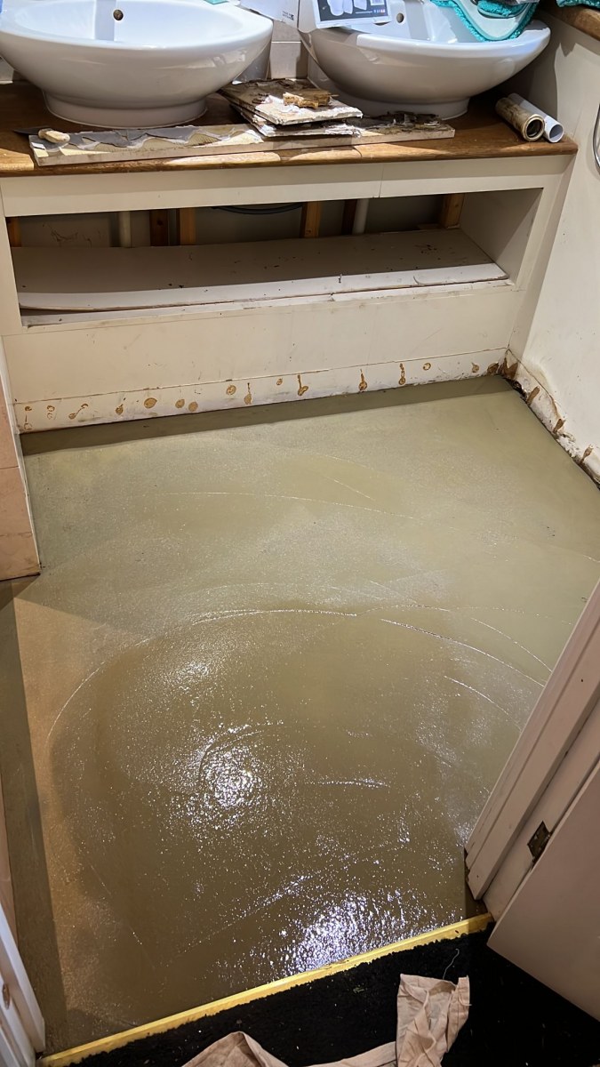 Great team effort to take up this cracked shower tray, replace the gully, screed and lay mosaic tiles and at the same time take up the flooring, dry-out, screed and replace with lovely fresh flooring in a client’s en-suite.