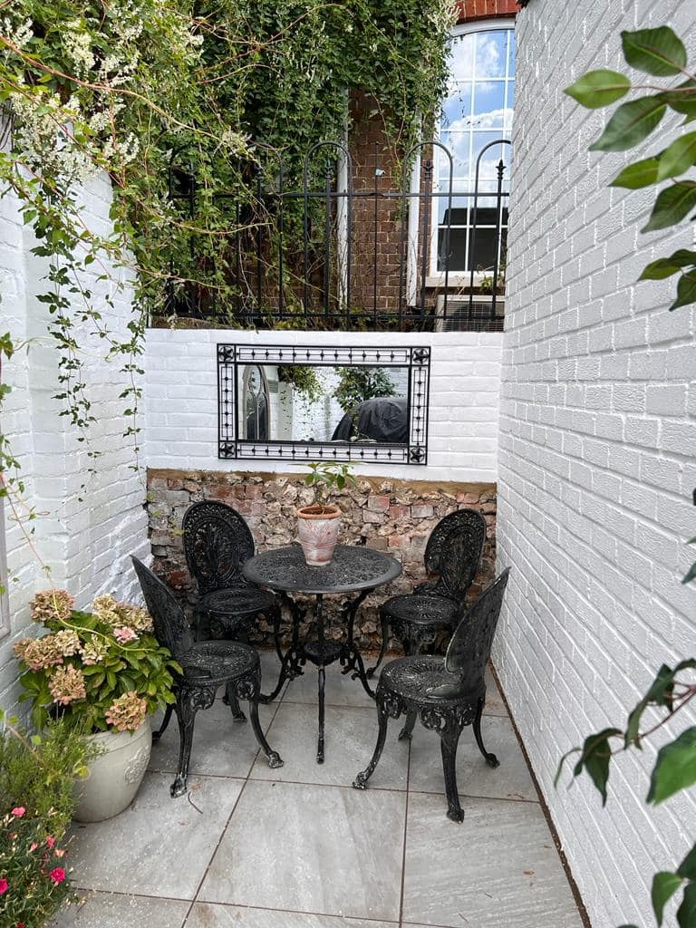 A recent project including creating a lovely patio area, painting the garden walls, adding railings and don’t the mirrors look effective!